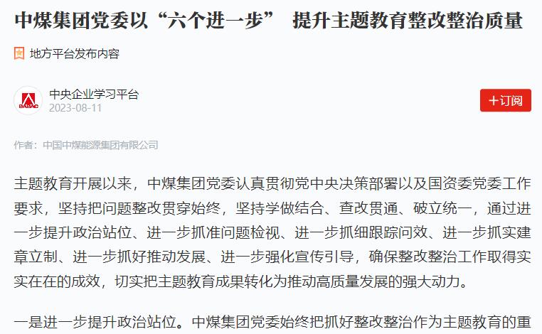 【学习强国】中煤集团党委以“六个进一步” 提升主题教育整改整治质量
