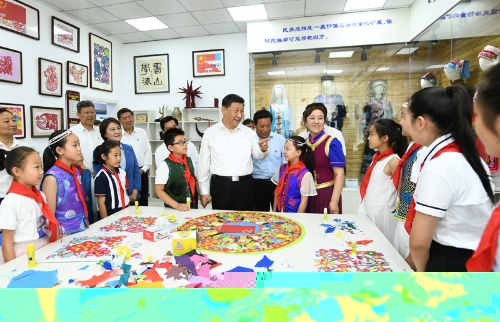 7月15日至16日,中共中央总书记、国家主席、中央军委主席习近平在内蒙古考察并指导开展“不忘初心、牢记使命”主题教育。这是15日上午,习近平在赤峰博物馆同古典民族史诗《格萨(斯)尔》非物质文化遗产传承人亲切交谈。